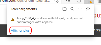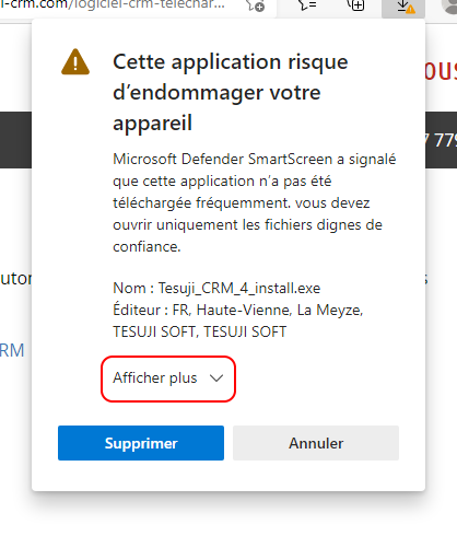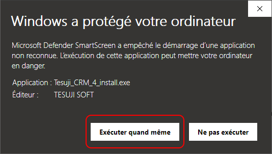 Le filtre Smartscreen de Microsoft peut éventuellement bloquer l'installation de Tesuji CRM et vous indiquer que ce n'est pas un logiciel fréquemment téléchargé car effectivement celui-ci n'est pas un logiciel grand public.